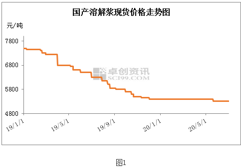 2020年上半年溶解漿價格窄幅下行,國產闊葉溶解漿含稅到廠價均價5377元/噸,較去年同期下降23%。從圖1可以看出今年上半年變化幅度不大,去年四季度漿價已降至近五年新低,來到國產漿廠生產成本線附近,幾無調價空間。2020年一季度受到公共衛生事件影響,溶解漿市場交投清淡,國產漿成交價低位盤整。二季度終端出口訂單減少,溶解漿市場延續弱勢運行,漿價承壓窄幅下行,5月份國產闊葉溶解漿含稅到場價下探至5300元/噸。漿價持續低迷原因是: