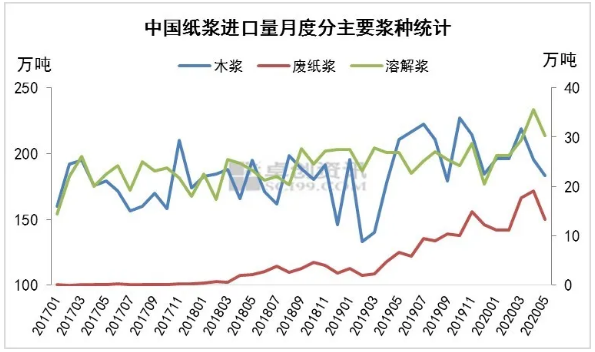 據(jù)海關(guān)數(shù)據(jù)顯示,2018年廢紙漿進(jìn)口量29萬噸,同比增加2371%;2019年進(jìn)口廢紙漿量91萬噸,同比增加209%;2020年前5個(gè)月進(jìn)口量73萬噸,較2019年前5個(gè)月廢紙漿進(jìn)口量同比增加280%,已經(jīng)占到2019年總進(jìn)口量80%,前5個(gè)月廢紙漿的進(jìn)口量占紙漿進(jìn)口總量的6%,較去年同期占比增加4.09個(gè)百分點(diǎn)。預(yù)計(jì)2020年廢紙漿進(jìn)口量持續(xù)增加,有望增加至200萬噸。
